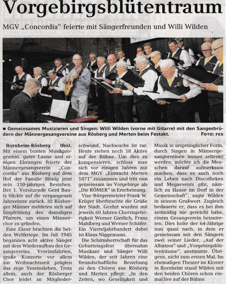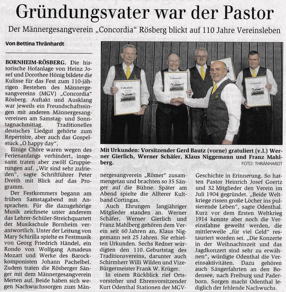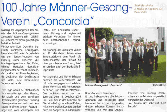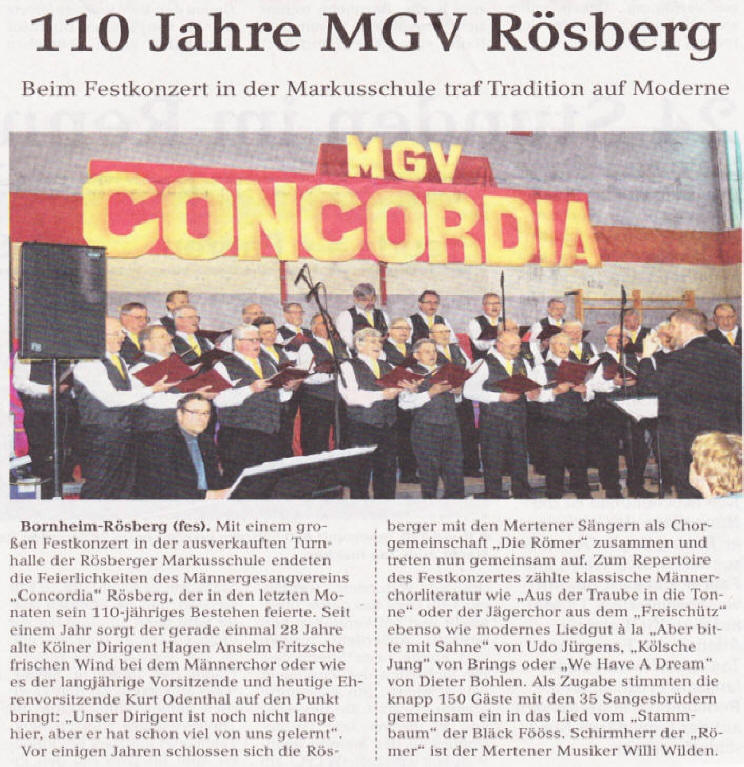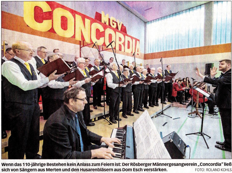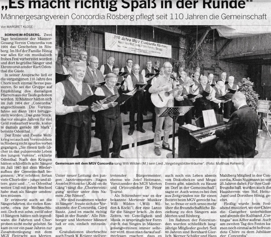 Der Männergesangverein "Concordia" Rösberg zählt zurzeit 24 aktive und mehr als 80 inaktive Mitglieder. Anlässlich des Jubiläums hatten die Männer im vergangenen Jahr ein großes Zelt aufgebaut, in dem sie drei Tage lang ein buntes Programm boten. "Das war ein großer Erfolg. Insgesamt hatten wir an die tausend Besucher", freute sich Odenthal rückblickend. Auch gab es einen Festzug, an dem zwölf befreundete Gesangvereine und alle Vereine aus dem Dorf teilnahmen.