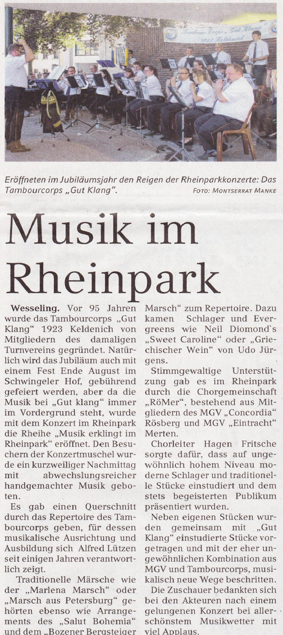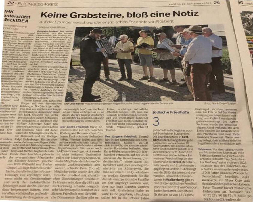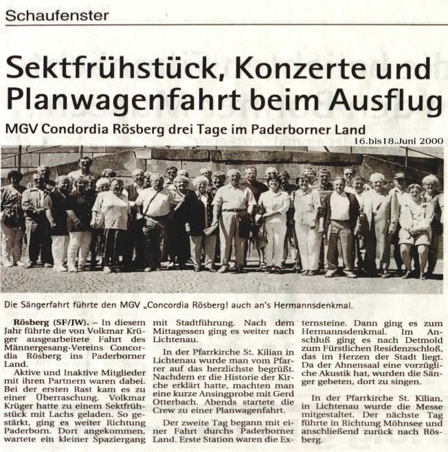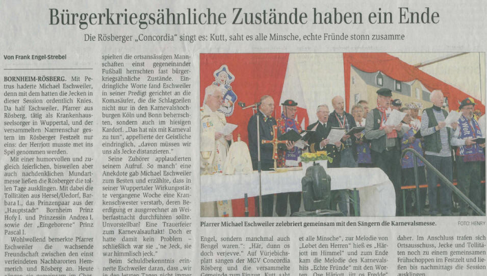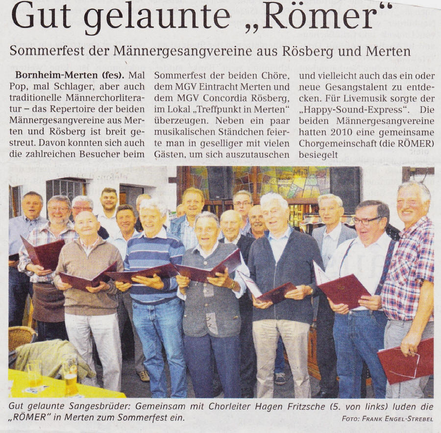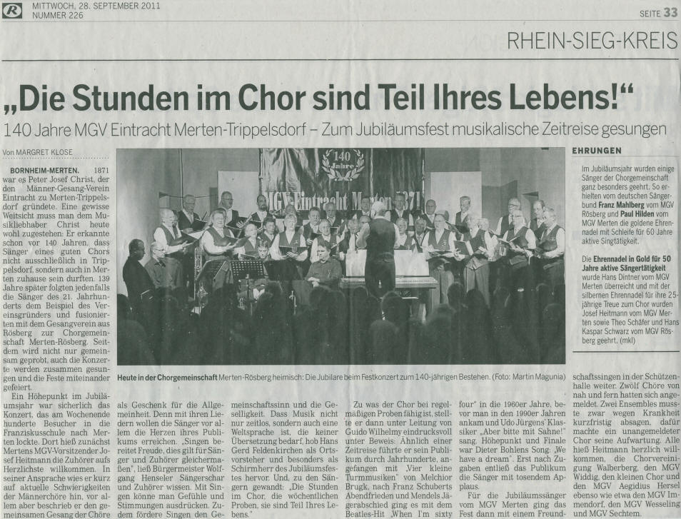Der Männergesangverein "Concordia" Rösberg zählt zurzeit 24 aktive und mehr als 80 inaktive Mitglieder. Anlässlich des Jubiläums hatten die Männer im vergangenen Jahr ein großes Zelt aufgebaut, in dem sie drei Tage lang ein buntes Programm boten. "Das war ein großer Erfolg. Insgesamt hatten wir an die tausend Besucher", freute sich Odenthal rückblickend. Auch gab es einen Festzug, an dem zwölf befreundete Gesangvereine und alle Vereine aus dem Dorf teilnahmen.
