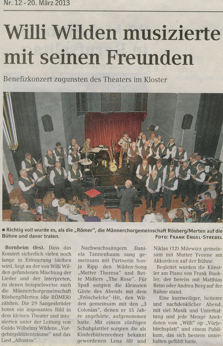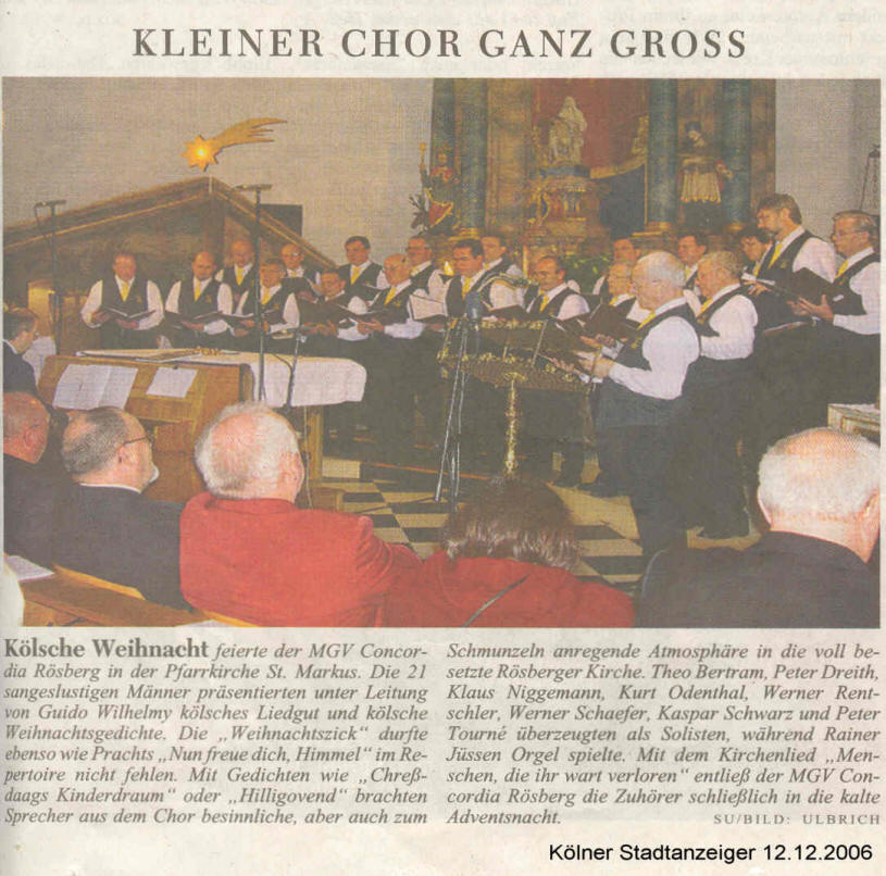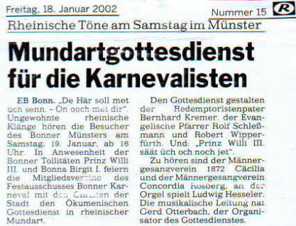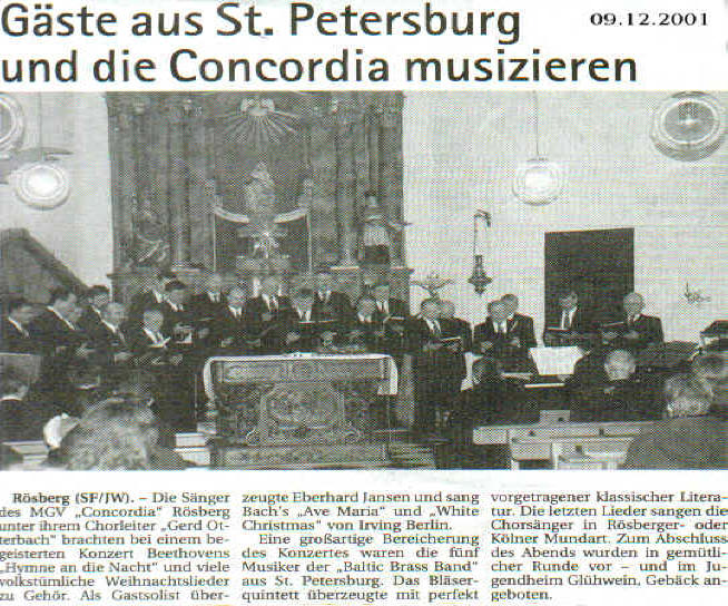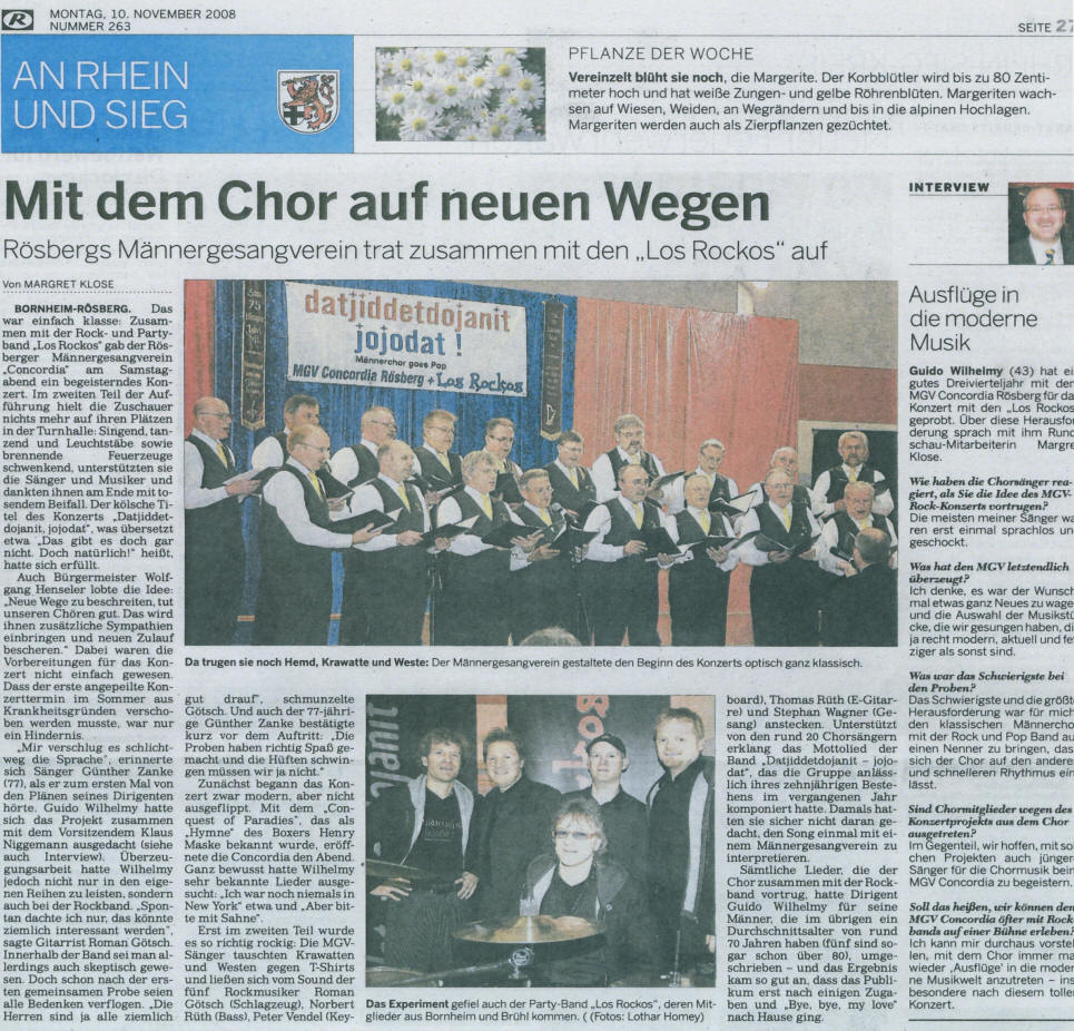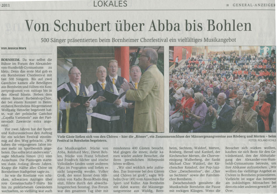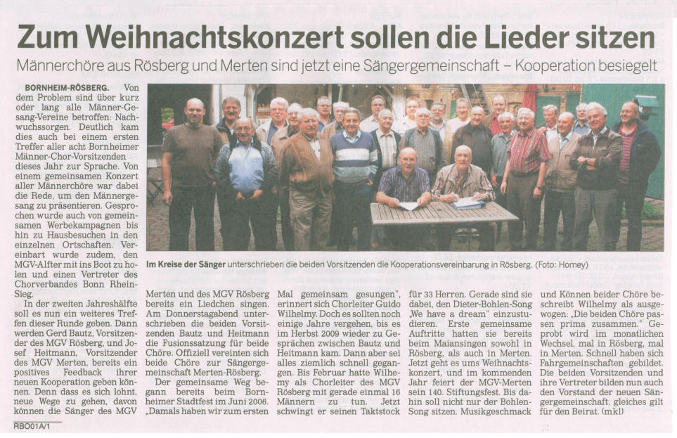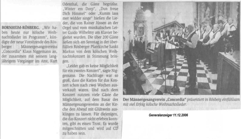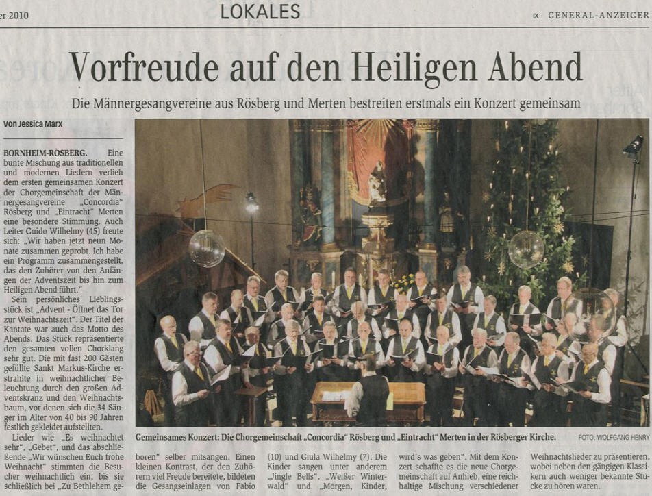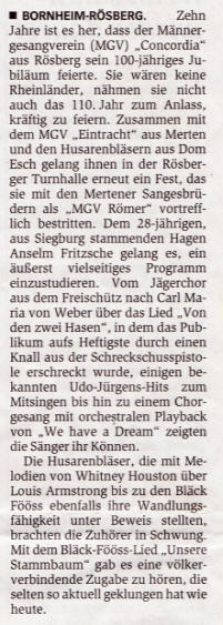 Eine Mischung aus modernen Liedern wie "Conquest of Paradise" und traditionellen Gesängen erfreute sowohl die jungen als auch die älteren Gäste. Die Kooperation mit dem Endenicher Chor besteht schon seit längerem. "Wir wollten damals die Mundartmesse im Bonner Münster, die dort früher immer von den Rösbergern und dem Chor aus Graurheindorf an Karneval gesungen wurde, wiederbeleben. Da der Dirigent aus Rösberg alle Noten besaß, haben wir uns an ihn gewandt. Gemeinsam singen wir nun jedes Jahr an Karneval die Mundartmesse im Münster", erläuterte Wolfgang Leyer vom Gesangverein Endenich den Beginn der Zusammenarbeit beider Vereine, die mittlerweile sogar den gleichen Dirigenten haben. Guido Wilhelmy übte mit den Chören jeweils getrennt das Konzert ein. "Wir haben uns vorher nur zwei Mal treffen müssen, um gemeinsam zu singen. Es war ein großer Vorteil, einen Dirigenten für beide Gruppen zu haben", so Leyer.